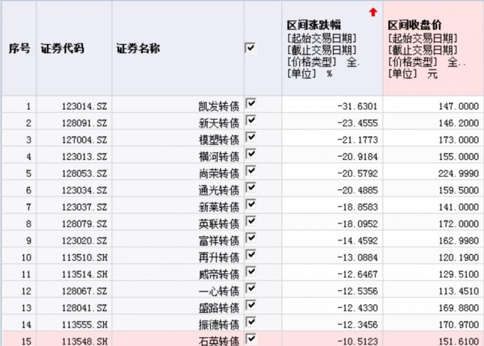 目前交易的225只可转债中,本周有15只可转债的累计跌幅超过10%,其中凯发转债跌幅最大,达到31.68%;其次是新天转债,重挫23.46%。从上周四开始新天转债就已经出现调整,四个交易日已经出现腰斩走势。
