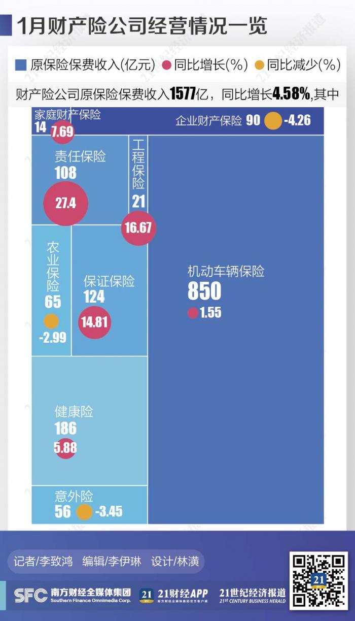 3月23日,中国银保监会公布的1月保险业经营数据显示,财产险原保险保费收入1336亿元,同比增长2.38%。其中,机动车辆保险原保险保费收入850亿元,同比增长仅有1.55%。