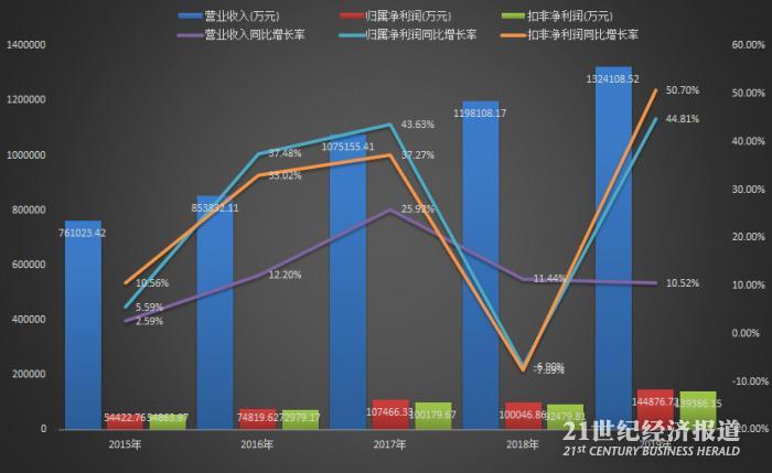 生益科技2020年3月25日发布2019年年度报告,生益科技2019年营业收入1324108.52万元,同比增长10.52%;归属净利润144876.72万元,同比增长44.81%;扣非净利润139366.15万元,同比增长50.70%。净利润、扣非净利润增幅均远高于营收增幅,亦创下近5年来新高。