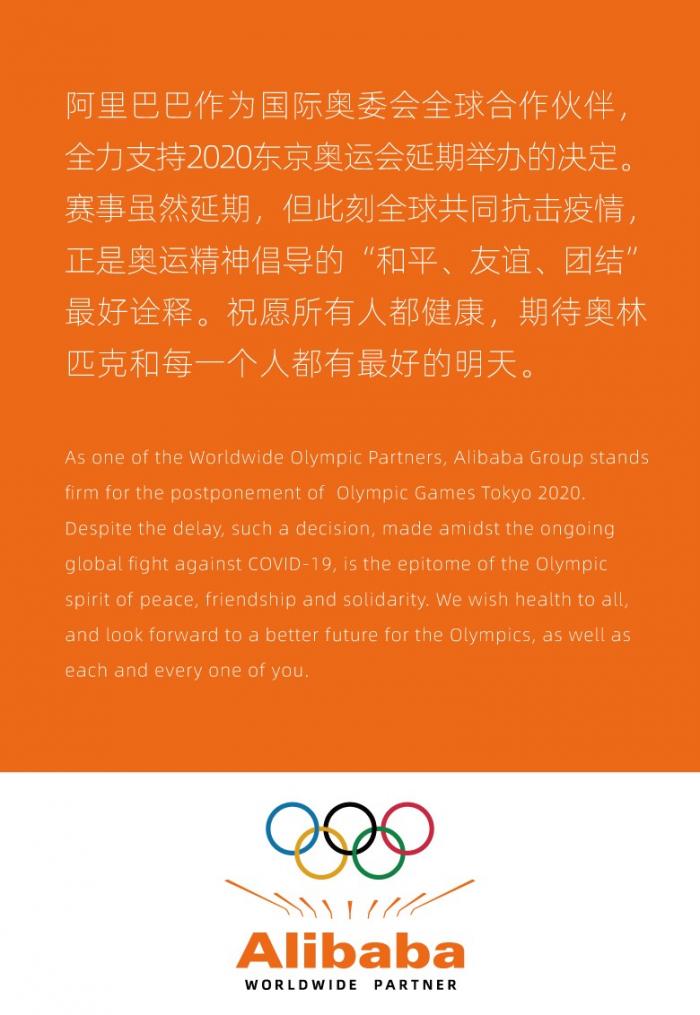 阿里巴巴表示,虽然赛事延期,但此刻全球共同抗击疫情,正是奥运精神倡导的“和平、友谊、团结”的最好诠释。在用数字化能力支持全球抗击疫情的同时,阿里参与的各项奥运筹备工作将继续推进。