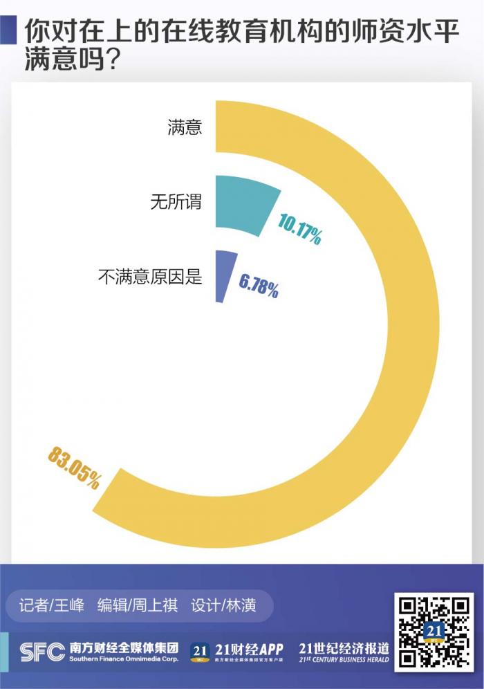 教育部等六部门《关于规范校外线上培训的实施意见》提出了师资合格的监管要求,要求不得聘用中小学在职教师。从事语文、数学、英语、思想政治、历史、地理、物理、化学、生物等学科知识培训的人员应当具有国家规定的相应教师资格。聘用外籍人员须符合国家有关规定。要在培训平台和课程界面的显著位置公示培训人员姓名、照片和教师资格证等信息,公示外籍培训人员的学习、工作和教学经历。问卷调查显示,总体上,对在线教育头部公司师资水平表示满意的用户占大多数。