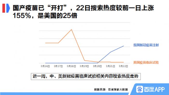 不过从百度大数据来看,国人对中国疫苗的兴趣提升度更高。3月22日,“我国新冠疫苗注射”搜索热度较前一日上涨155%,是“美国疫苗临床试验”的25倍。