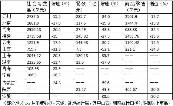 河南省1-2月份的餐饮收入27.49亿元,同比下降43.3%;福建省实现社会消费品零售总额2739.58亿元,同比下降15.0%。餐饮消费滑落较多,全省餐饮收入245.82亿元,下降27.3%。