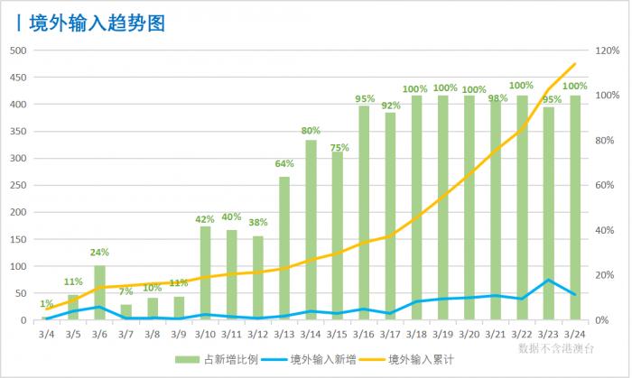 另一方面,境外疫情输入性风险不断加大。3月24日,全国新增确诊病例47例,均为境外输入病例,其中上海19例,北京5例,广东5例,天津4例,福建4例,内蒙古2例,江苏2例,四川2例,吉林、浙江、山东、陕西各1例。其中,内蒙古、吉林是首次出现境外输入病例。