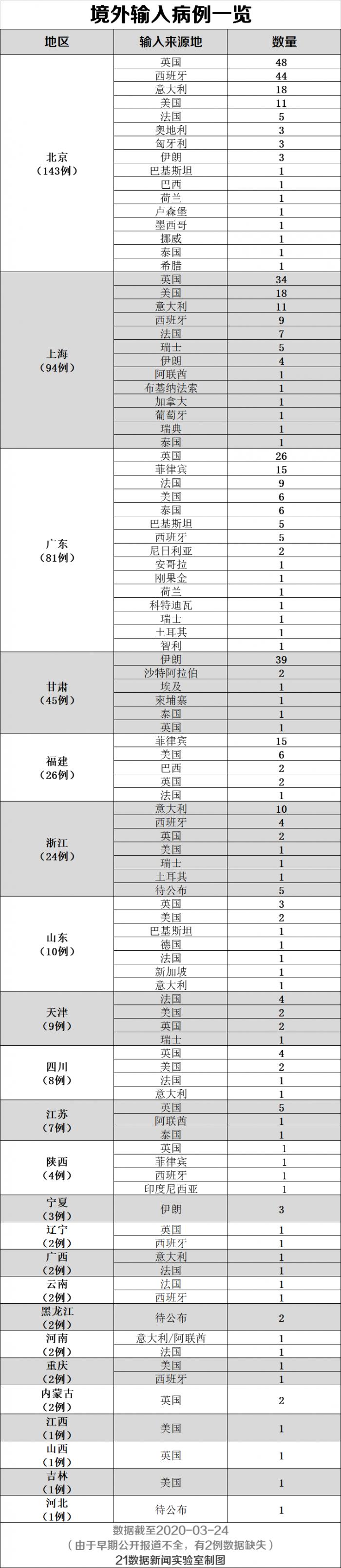 英国、伊朗、西班牙、意大利、美国等疫情严重地区,是境外输入主要来源地。截至3月24日24时,英国已累计输入病例132例,西班牙输入66例,美国输入51例,伊朗输入49例,意大利输入43例。