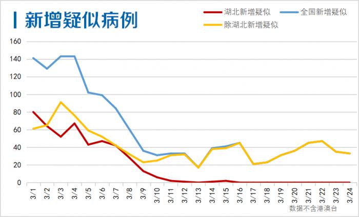 截至3月24日24时,全国现有疑似病134例,新增疑似病例33例,均为境外输入病例。湖北新增疑似连续9天0增长,现有疑似病例保持为零。