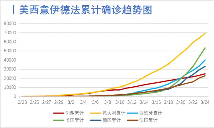 除中国外,已有6个国家确诊数超过两万。意大利累计确诊69176例,美国53268例,西班牙42058例,德国32986例,伊朗24811例,法国22622例。为了遏制新冠肺炎疫情,波兰、加拿大等多个国家已宣布关闭国境,印度、英国、意大利、比利时等国实行全国“封城”。