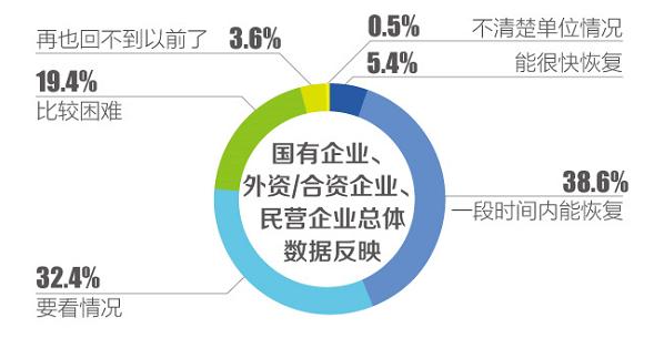 令人意外的是,在很多企业停止生产、没有复工的前提下,我国民众对疫后所在单位能否恢复到疫前经营水平的问题中,还是比较有信心的。调查显示,5.4% 受访者认为能很快恢复,38.6%受访者认为一段时间内能恢复,32.4%受访者认为视情况而定,持保守态度,只有3.6%受访者认为所在单位的经营水平无法回到疫情水平。