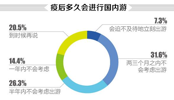 民众虽然在家隔离许久,按理说应该向往外面的世界。但是对于旅游,受访者并不热衷,主要原因还是忌惮新冠病毒。调查显示,31.6%的受访者两三个月之内不会考虑出游,26.3%的受访者半年内不会考虑出游,还有14.4% 的受访者一年内不会考虑出游。