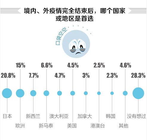 对于境外游,疫情完全结束后受访者出国游首选日本,其次是欧洲。