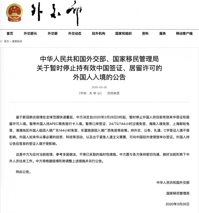 3月26日,外交部、国家移民管理局发布关于暂时停止持有效中国签证、居留许可的外国人入境的公告:鉴于新冠肺炎疫情在全球范围快速蔓延,中方决定自2020年3月28日0时起,暂时停止外国人持目前有效来华签证和居留许可入境。暂停外国人持APEC商务旅行卡入境。暂停口岸签证、24/72/144小时过境免签、海南入境免签、上海邮轮免签、港澳地区外国人组团入境广东144小时免签、东盟旅游团入境广西免签等政策。持外交、公务、礼遇、C字签证入境不受影响。