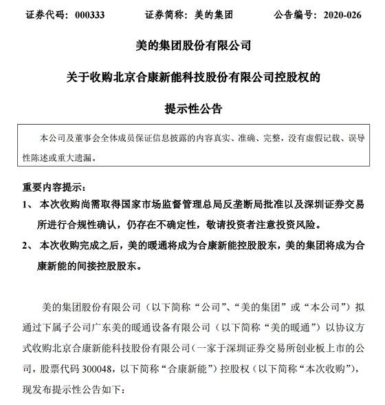 3月25日深夜,美的集团(000333.SZ)发布公告,集团拟通过旗下子公司广东美的暖通设备有限公司(下称“美的暖通”)收购北京合康新能科技股份有限公司(下称“合康新能”)18.73%股份,交易总价约7.4亿元。