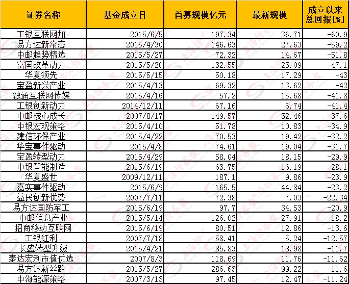 以下则是成立时间五年以上、首募规模超过50亿元并且迄今依然亏损超过10%的基金。