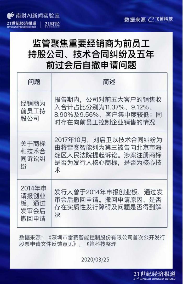 2019年4月19日,雷赛智能收到证监会《深圳市雷赛智能控制股份有限公司首次公开发行股票申请文件反馈意见》,证监会就公司规范性、信息披露、财务会计资料相关和其他问题方面四个方面提出了48个细分问题。值得关注的有向前员工控制经销商销售的情况和关于商标和技术合同诉讼纠纷和五年前过会后自撤申请问题这三个问题。