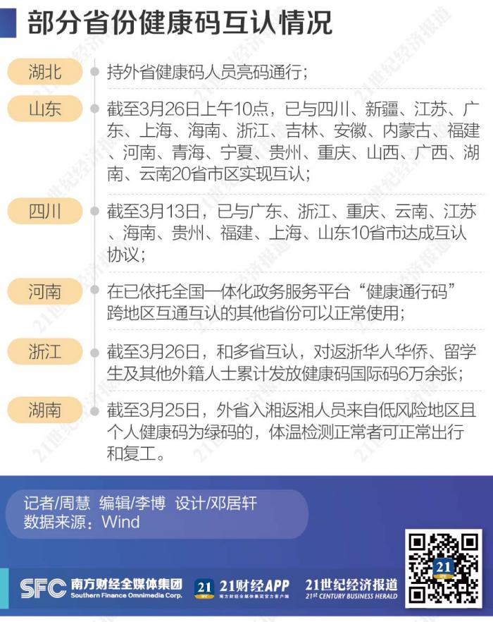 截止到3月26日,湖北健康码已经可以和浙江、广东、湖南、江苏等省份的多个城市健康码互通。除北京和湖北以外地区,全国范围内的健康码互认正在加速推行。