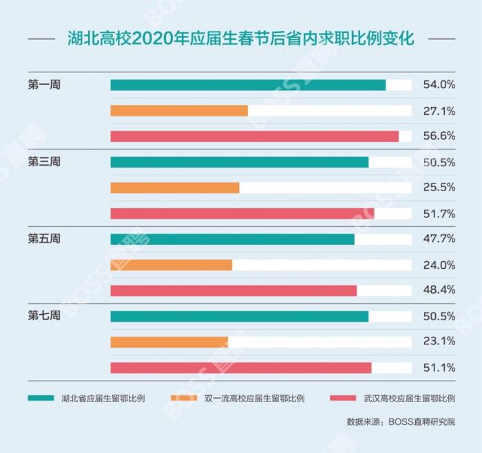 BOSS直聘研究院观察到,2019年11月和12月期间,湖北省的大专及以上学历应届生中有72%期望留在湖北省发展,武汉市的2020年应届生期望留在湖北省发展的比例高达75%。