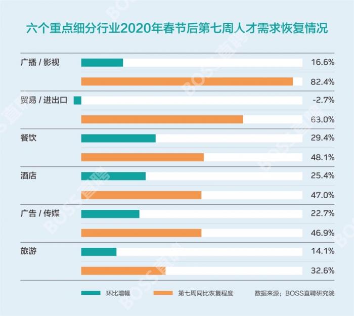 BOSS直聘研究院追踪观察显示,节后七周,餐饮、酒店、旅游、影视、广告传媒等受疫情影响最为严重的行业均出现不同程度的复苏。其中,广播/影视行业复苏较快,节后七周的人才需求已经达到2019年同期的82.4%。影视行业需求复苏的转折点在第五周(3月2日)开始显现,人才需求量环比第四周增幅达到67.7%,但仍以线上视频类为主。目前,影视项目的线下拍摄恢复进度有限,小部分恢复营业的影院票房也十分惨淡,线下影视和演出行业的回暖之路依然漫长。
