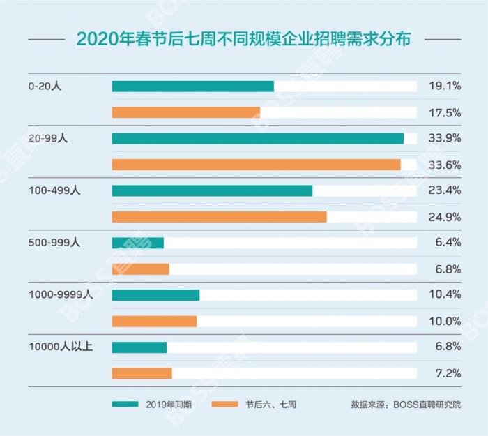 3月26日,招聘平台BOSS直聘发布《2020春节后七周就业市场追踪报告》。报告显示,七周过去,市场人才需求已基本恢复到去年同期水平。其中,需求快速增长点出现在节后第四周(2月24日起);进入第六周,企业招聘需求进入平稳增长期,保持着10%左右的周环比增速,求职者的活跃规模已超出2019年同期规模。