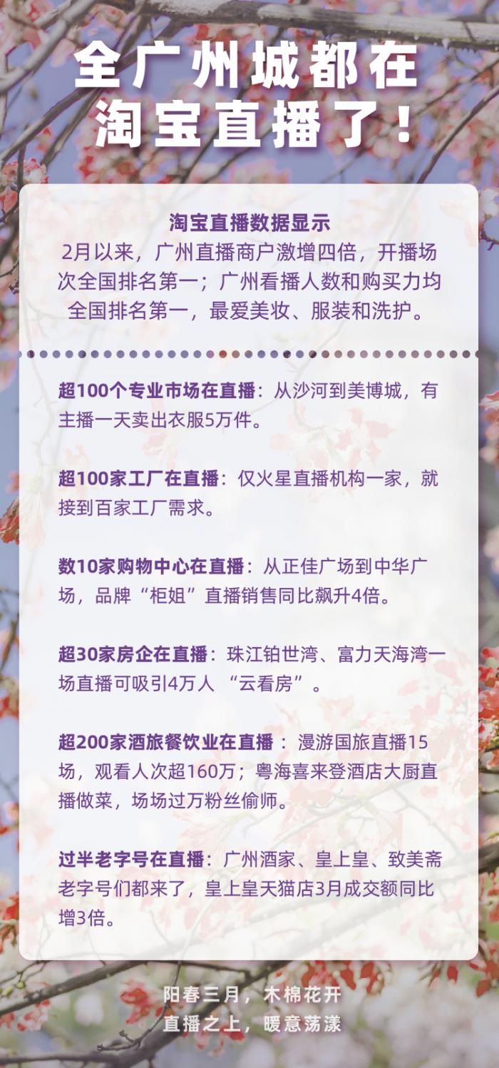 广州作为千年商都,拥有开放的氛围,拥有强大的货源供应,直播有着优沃的成长土壤。特别是此次疫情之下,淘宝直播成为广州各行各业打开新经济大门的钥匙。数据显示:2月以来,淘宝直播商户激增四倍,速度位居前列;开播场次全国排名第一。