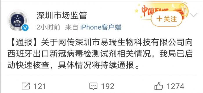 关于网传深圳市易瑞生物科技有限公司向西班牙出口新冠病毒检测试剂相关情况,我局已启动快速核查,具体情况将持续通报。