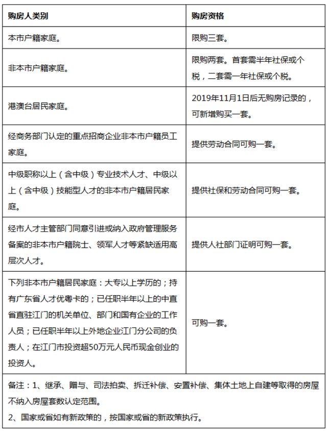 由上表可见,江门本市户籍家庭可购买三套房,非本市户籍家庭可购买两套房,但首套房需提供半年社保或个税,二套房需提供一年社保或个税。如果非本地户籍家庭中有大专以上学历的,则可以不受限制直接购买一套房。