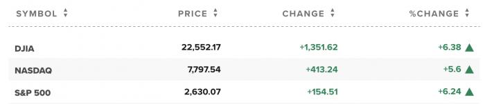 当地时间3月26日,尽管美国上周首次申请失业救济人数创新高,但是受美国参院通过2万亿美元刺激计划、G20将启动5万亿美元提振经济计划等一系列利好消息提振,美股三大股指集体上涨,其中,道指最近三个交易日涨超20%,为一个月来首次实现“三连涨”。截至收盘,道琼斯工业平均指数涨6.38%,报22552.17点;纳斯达克综合指数涨5.6%,报7797.54点;标普500指数涨6.24%,报2630.07点。