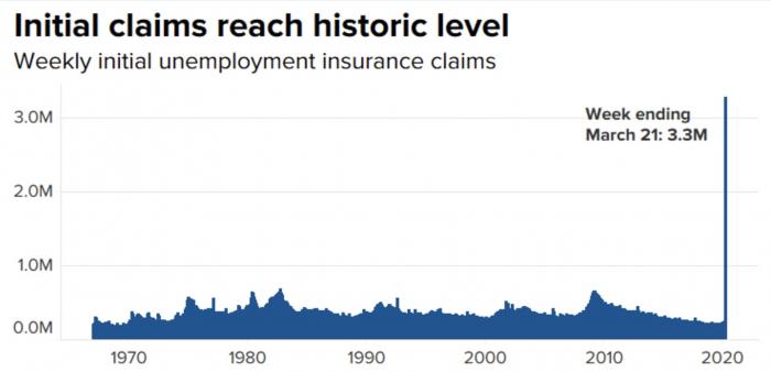 当地时间3月26月盘前,美国劳工部宣布,上周首次申请失业救济人数大幅度攀升到328万人,高于预期的150万人,也远高于上周的28.1万人,环比上涨1067%,创下有史以来最为糟糕的单周失业数据。这一数字打破了2009年3月“大衰退”(Great Recession)时期66.5万人的峰值,以及1982年10月创下的69.5万人的历史最高纪录。