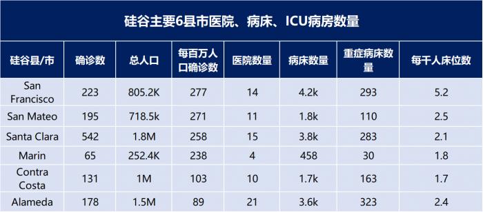 根据美国医疗数据、情报提供商Definitive Healthcare的数据显示,21记者对硅谷主要6县市的医院数量、病床数量、ICU病房数量统计如下表所示: