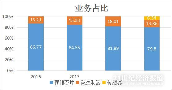 公司的存储芯片主要指闪存芯片产品,主要有代码型闪存芯片(NORFlash)和数据型闪存芯片(NANDFlash)两类产品,前者主要用于少量数据存储,后者则用于大容量数据存储。该业务为公司第一大业务,营收贡献接近八成,其中NORFlash芯片贡献占比超96%;第二大业务微控制器产品占比不足两成,第三大传感器业务仅占比6.34%。