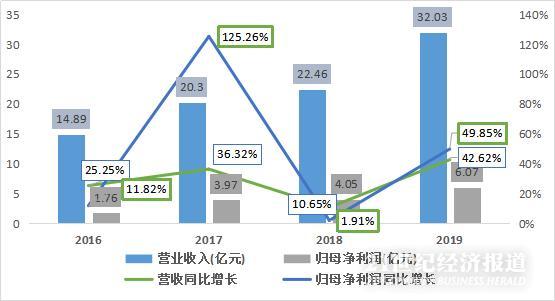 兆易创新2020年3月27日发布2019年年度报告,实现营业收入32.03亿元,同比增长42.62%;归属于净利润6.07亿元,同比增长49.85%;扣非净利润5.66亿元,同比增长56.7%。