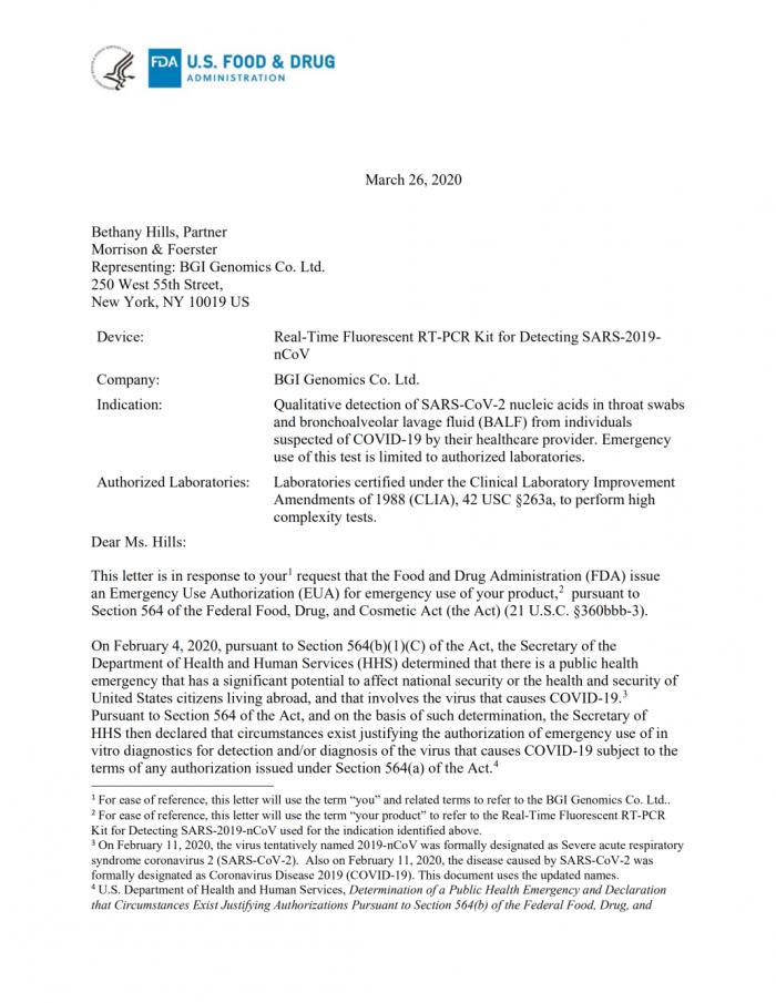 华大基因3月27日晚间公告,公司的新型冠状病毒核酸检测试剂盒近日获得了美国食品药品监督管理局(简称“FDA”)签发的紧急使用授权(简称“EUA”)。这是继该检测产品根据美国《新型冠状病毒肺炎在公共危机下的诊断检测政策指南》规定可面向美国临床市场进行商业销售之后,获得的正式进入美国临床市场销售的资质。