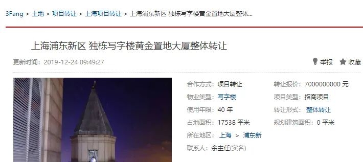 但记者近日再次打开3Fang网站时,却发现项目介绍中对黄金置地大厦的市场估值变成了“不低于100亿元”,整体转让价仍为70亿元。信息更新时间显示为2019年12月24日。
