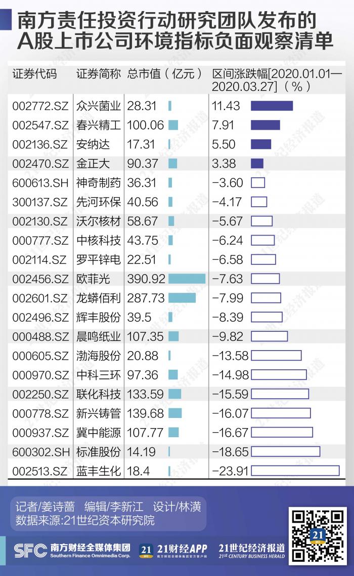 南财智库、21世纪经济报道南方责任投资行动研究团队启动了上市公司ESG调查,基于环境、社会责任和公司治理三个维度分别制定了A股上市公司评价体系。分别形成了100家正面观察清单和20家负面观察清单。