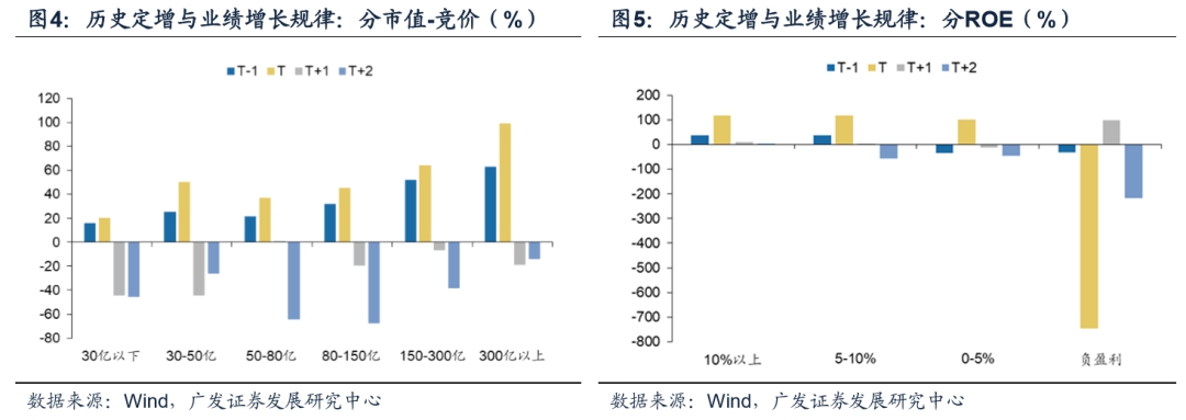 (4)基本面(ROE):高ROE企业业绩增长更高且持续性更高,竞价/定价发行的规律基本与整体一致,ROE>10%组别净利增速近120%且连续为正。ROE和定增当年业绩增速相关系数约0.45。