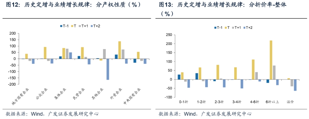 ①行业:竞价类中涉及大订单/项目、融资需求与盈利兑现逻辑联系更为紧密的行业业绩助推更明显(如通信/公用/交运等),定价类大股东参与概率更大且多涉及并购,对于科技成长与金融的业绩增厚更为显著(纺服/TMT/非银)。