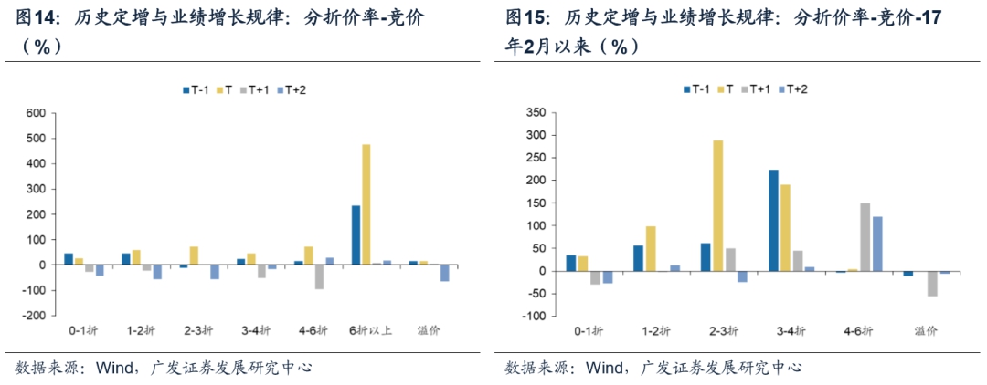 (9)业绩增长与折价率关联性:对于业绩预期增长不高或负增长的项目,一般谨慎给予较低折价(低于10%)或溢价发行;折价程度与业绩提振的绝对/相对幅度基本成正相关,深度折价往往对应业绩高反弹;17年限制定价基准日后,折价空间大幅压缩,市场共识和基本面思路强化,不同折价区间内的业绩增长离散程度降低,竞价项目折价程度与业绩增长程度正相关,定价项目则无明显关系。