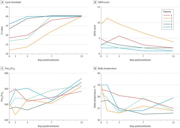 研究观察的5位病人年龄介于36岁到65岁,在接受血浆疗法时已经进行机械通气,并且具有比较高的病毒载量。输入血浆后,有4名患者在3天内体温恢复正常,贯序器官衰竭估计(SOFA)降低,而氧合指数显著升高。输血后12天内,病毒载量也下降并变为阴性,相应中和抗体SARS-CoV-2结合抗体和中和抗体滴度增加。输血治疗2周内,有3例患者摆脱机械通气。目前,这5例患者中,有3例已经出院,另外2例病情稳定。