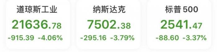 收盘时,美股三大股指跌幅皆超3%。道指下跌915.39点,或4.06%,报21636.78点;纳指跌295.16点,或3.79%,报7502.38点;标普500指数跌88.60点,或3.37%,报2541.47点。