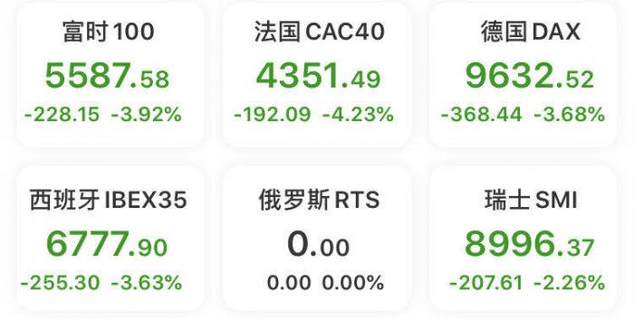 而周五当天欧股也集体大跌。德国DAX指数下跌3.71%,报9630.25点;英国富时100指数下跌5.24%,报5511.25点;法国CAC40指数下跌4.23%,报4351.49点;意大利富时指数下跌3.04%,报16842.00点;欧洲斯托克50指数下跌4.26%,报2726.55点。