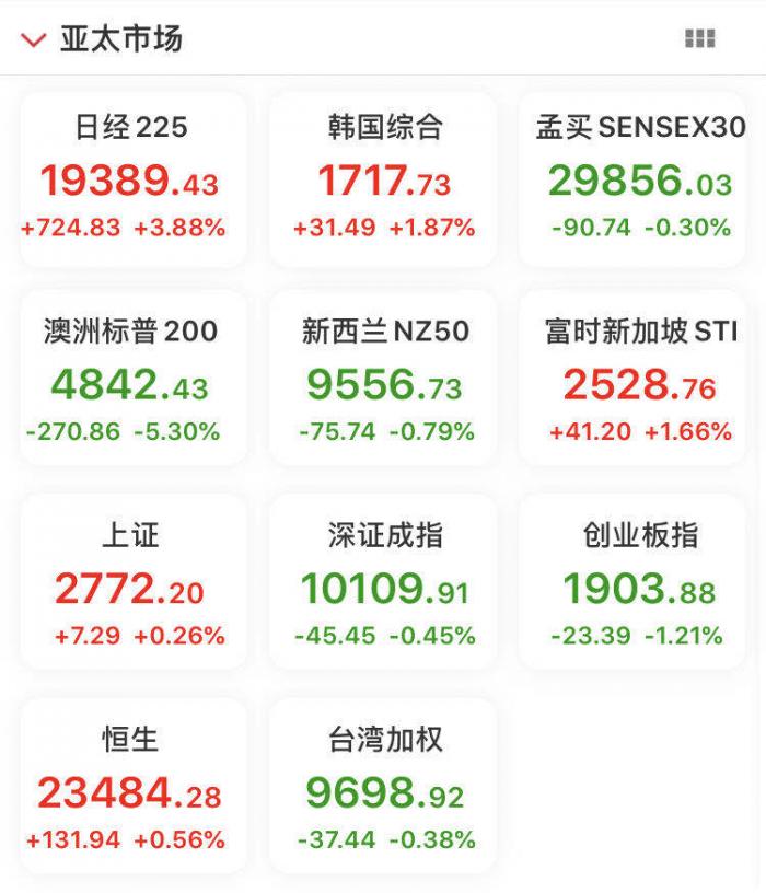 当天,日经225指数、韩国综合指数、富时新加坡STI指数分别涨3.88%、1.87%、1.66%。