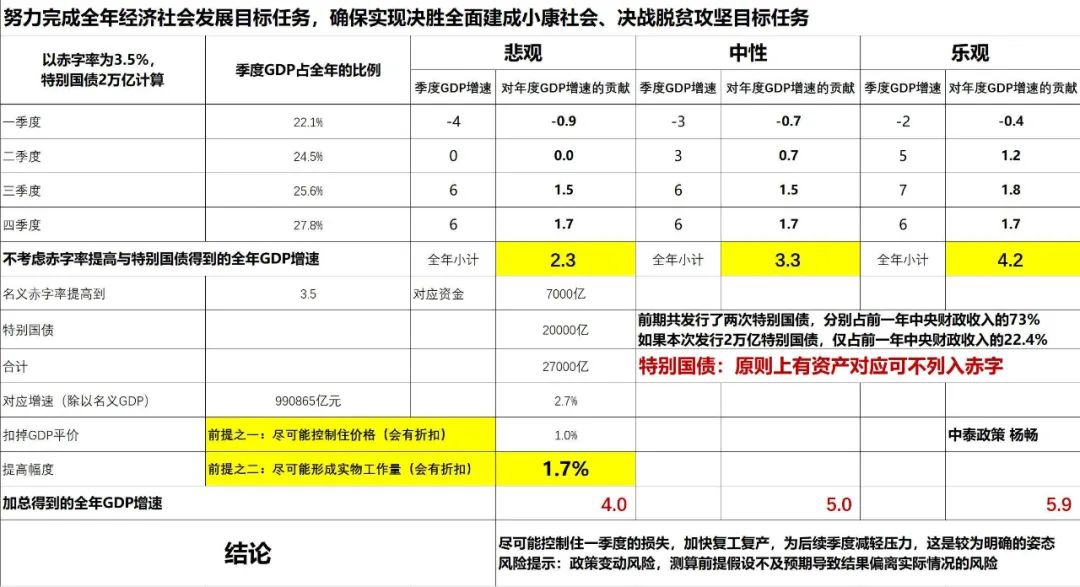 因此,当前要预测国内全年GDP,只能建立在太假的假设基础上。包括一些境外大行大幅调低美国的GDP增速,实际上也没有什么基础数据做支撑,只是为了迎合机构投资者的需求。由于疫情原因,目前两会还未召开,估计四月下旬或五月上旬有望召开。要预测全年GDP,至少要等到发改委的发展目标报告和财政部的预算报告出台。 注意到最近高层领导的数次公开讲话,都反复强调要实现全面脱贫和奔小康的目标,这是否意味着GDP翻番目标(2020年必须达到5.6%以上)依然未变?若如此,则在财政支出上势必会有大突破。