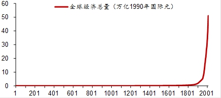 之后全球又经历了第二次和第三次工业革命,农业和工业产量大幅上升,随着交通运输的极大改善,信息技术的广泛应用,医疗防疫水平的极大提高,全球人口规模持续高增长。 如果把全球GDP总量进行历史对比,同样可以发现,从公元元年至1820年之间,全球经济年均增速只有0.1%,人均收入在这1800多年的漫长时间里只增长了40%多。在1820-2000年之间,全球经济增速达到2.2%,人均收入在180年的时间里增长了10倍多。