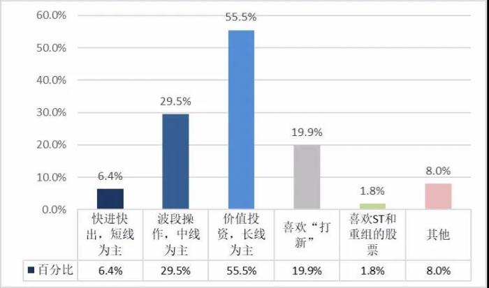 与之相比,有55%的受调查一般机构投资者倾向于价值投资,以长线操作为主,选择波段操作、以中线为主和喜欢“打新”的占比分别为29.5%和19.9%。