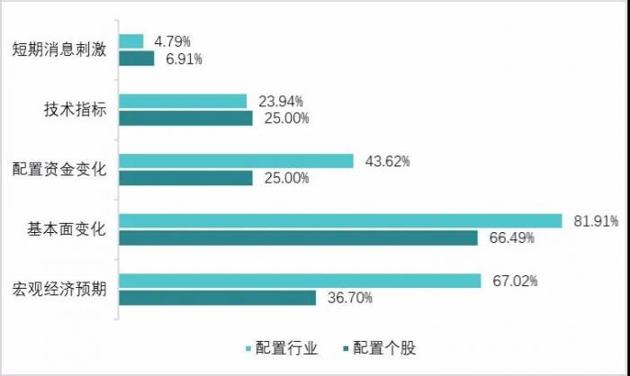 专业机构投资者在选取配置行业和个股时,基本面变化是其参考的首要因素,宏观经济预期是次要因素;此外,在配置行业时还会参考行业配置资金变化;在配置行业和个股时对于技术指标的关注度一般,考虑短期消息刺激占比较低,具体如下: