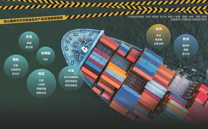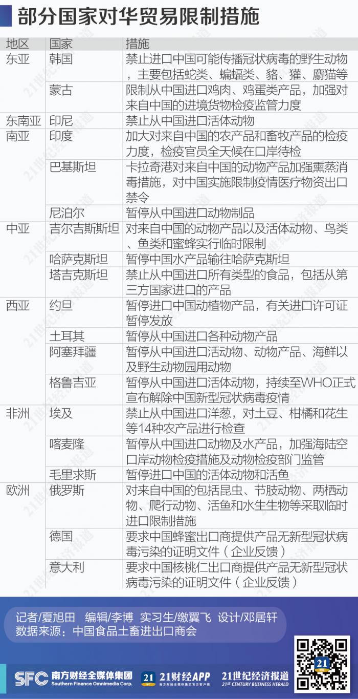 让食品外贸企业雪上加霜的是,疫情发生以来,不少国家针对中国的食品、农产品出口出台了一系列贸易限制措施。这包括韩国、印尼、俄罗斯、印度、土耳其等中国主要的农产品出口市场,这些措施大多针对中国的畜产品和水产品,也有不少国家将限制范围扩大到水果、蔬菜等领域,乃至所有类型的食品。