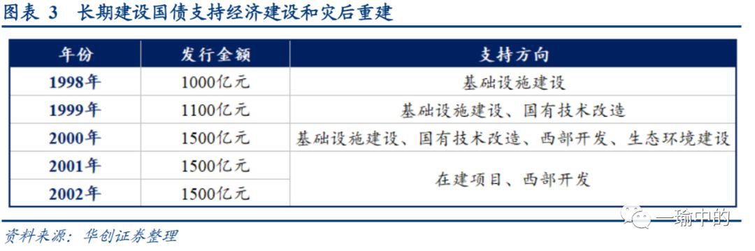 1998-2002年,我国发行长期建设国债6600亿元,带动银行配套贷款和其他社会资金,形成3.28万亿元的投资规模,着重于支持基础设施建设、国有企业技术改造、西部开发和生态环境建设。发行对象为国有商业银行,以此将一部分储蓄转化为投资而不导致货币过量发行。
