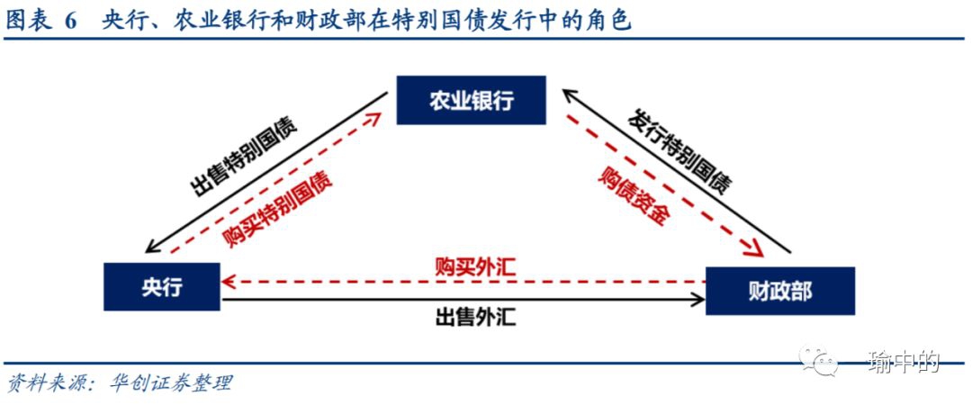 具体操作上,定向发行部分:第一步,由农业银行认购特别国债,此时在央行负债表中负债端的其他存款性公司存款下降,政府存款增加。第二步,财政部向央行购买等额外汇以用作中投的资本金,此时在央行资产负债表中,资产端的外汇占款下降,负债端政府存款下降。第三步,央行将卖汇所得的资金购买农行持有的国债。此时,央行负债表中的资产端里对政府债权增加,负债端其他存款性公司存款增加。这一过程最终导致央行资产端减少了13500亿元外汇储备,增加相应规模的对政府债权,负债端无变化,因此对流动性无额外冲击。