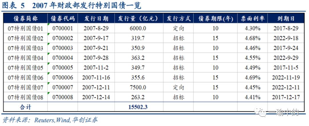 4、2007年特别国债成立中投。针对外汇储备突破万亿大关,同时国内经济过热、流动性过剩问题,本次特别国债的发行为财政部购入央行外汇,成立中投提供资金。