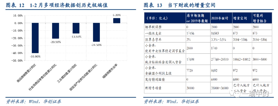 新冠疫情冲击下,预计1季度经济增速勉力实现0增长。短期疫情冲击致经济一度陷入“休克”状态,疫情下全国交通封锁、生产停滞、消费收缩, 1-2月多项经济数据创下历史新低:固投累计增速为-24.5%。社零累计同比增速为-20.5%,工业增加值累计同比增速为-13.5%。