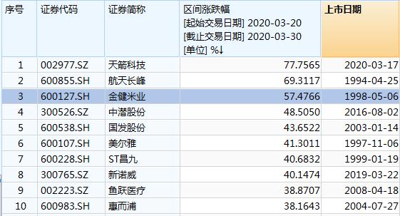 不出意外,当日再次涨停的金健米业,收盘后将成为3月下旬的A股涨幅王。
